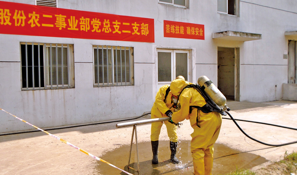6月6日下午農(nóng)一事業(yè)部雙甘膦分廠組織氨回收送農(nóng)二事業(yè)部液氨管道泄漏預(yù)案演練,事業(yè)部總經(jīng)理孟長(zhǎng)春擔(dān)任演練總指揮。6月19日,I草丙班與雙甘膦丙班聯(lián)合進(jìn)行了液氨槽裝卸管道泄漏演練。演練前值長(zhǎng)按照以往演練出現(xiàn)問題對(duì)原預(yù)案進(jìn)行了修改,并且進(jìn)行了泡沫消防炮、防化服穿戴專項(xiàng)訓(xùn)練。