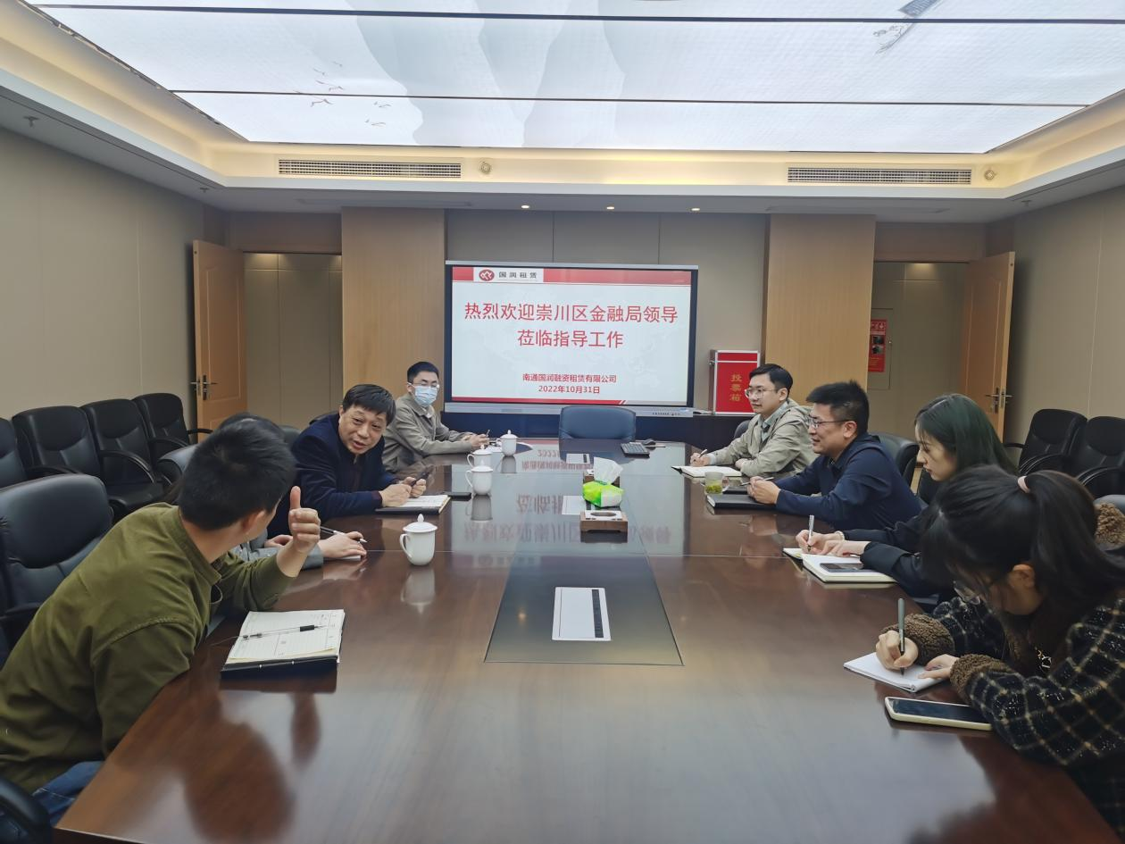 近期,崇川區(qū)金融局局長耿擁軍、副局長鈕卉華等一行四人蒞臨我司,就南通地區(qū)租賃行業(yè)及國潤公司發(fā)展現(xiàn)狀開展實地調(diào)研。國潤租賃黨支部書記、董事長陳大鵬和相關(guān)部門人員參加調(diào)研。