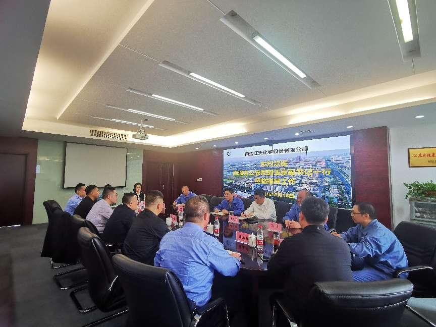 為全方位深度擰緊安全環(huán)保責任鏈條,進一步提高企業(yè)環(huán)保本質化治理能力和水平,10月18日上午,南通市公安局黨委副書記、副局長郭玉家一行來到南通江天化學股份有限公司開展工作走訪調(diào)研。江天化學黨支部書記、副總經(jīng)理張永鋒、黨支部副書記、副總經(jīng)理沙曉東、支部委員、副總經(jīng)理任建軍等陪同調(diào)研參觀。